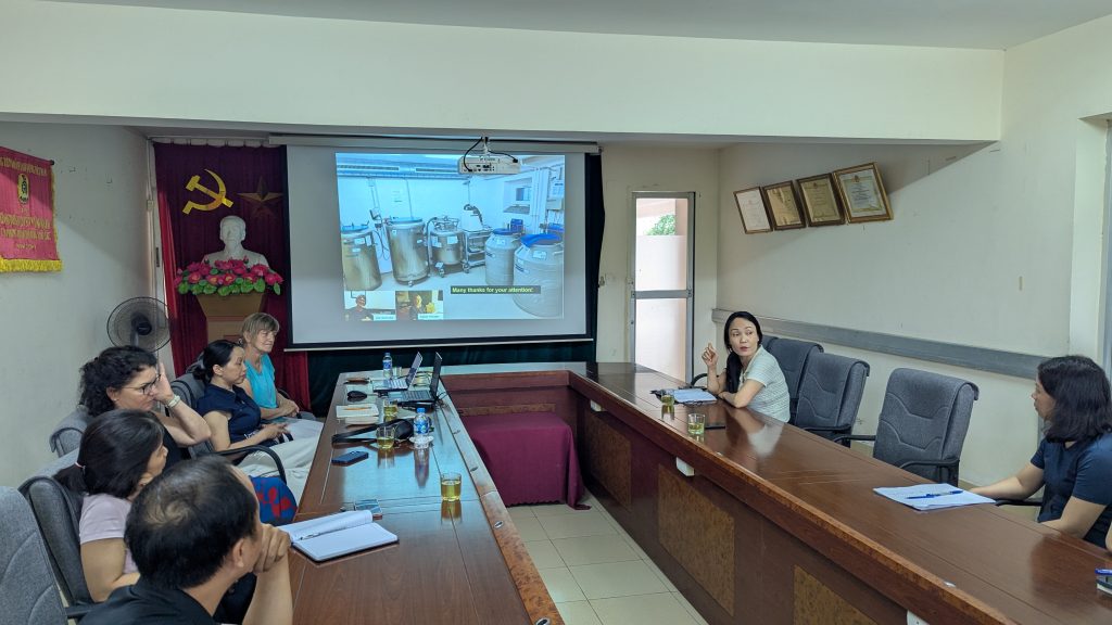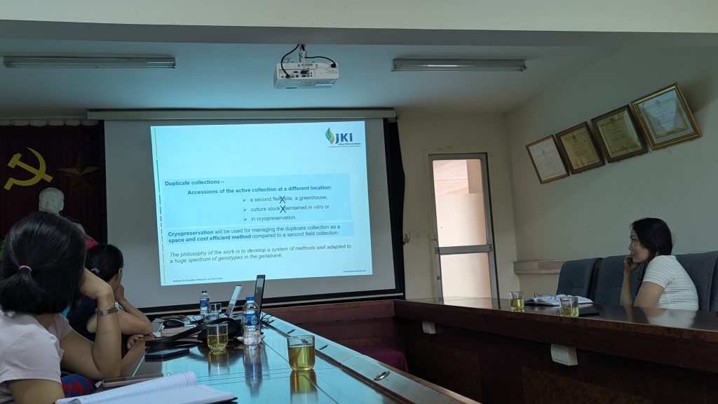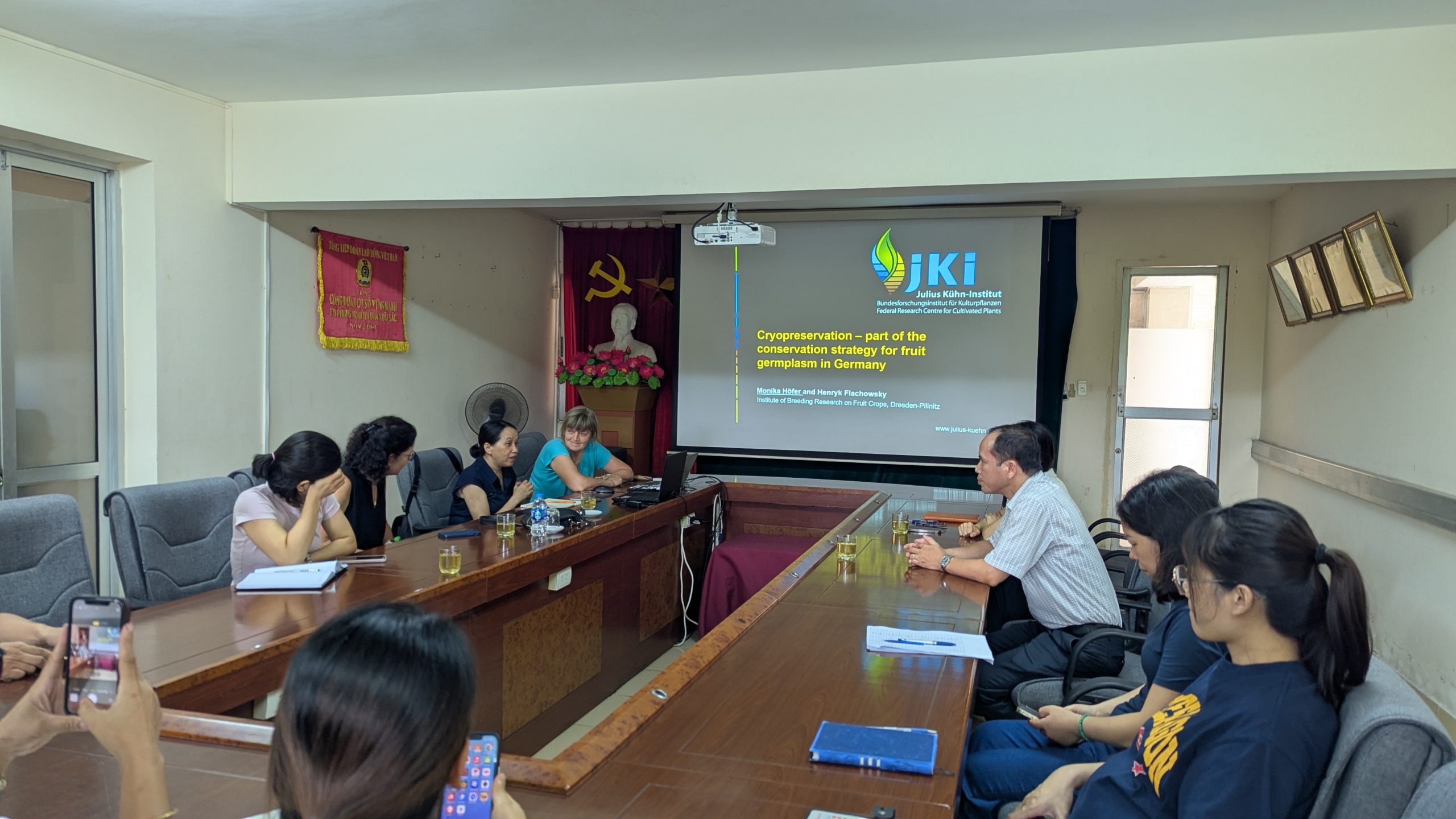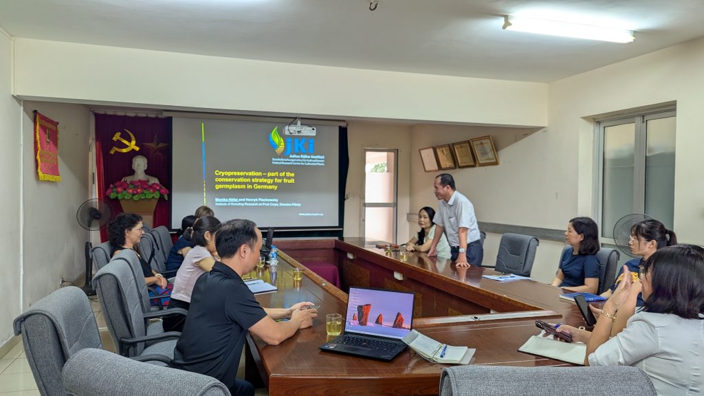 Trong chương trình, TS. Doris Monika Hofer trình bày báo cáo với chủ đề “Cryopreservation – part of the conservation strategy for fruit germplasm in Germany” (Bảo quản lạnh sâu – một phần trong chiến lược bảo tồn nguồn gen cây ăn quả tại Đức). Bà nhấn mạnh vai trò then chốt của công nghệ bảo quản lạnh sâu trong việc duy trì đa dạng di truyền, đặc biệt là bảo tồn lâu dài các giống cây quý hiếm, thích ứng với biến đổi khí hậu. TS. Hofer cũng phân tích những thách thức trong việc tích hợp cryopreservation vào hệ thống ngân hàng gen quốc gia nhằm tăng khả năng chống chịu hạn, sâu bệnh và nâng cao chất lượng giống. Nhân dịp này, TS. Hoàng Thị Lan Hương người vừa hoàn thành khóa đào tạo ngắn hạn về cryopreservation tại Julius Kühn-Institut – chia sẻ thêm về các kỹ thuật đã được học tập và thực hành.