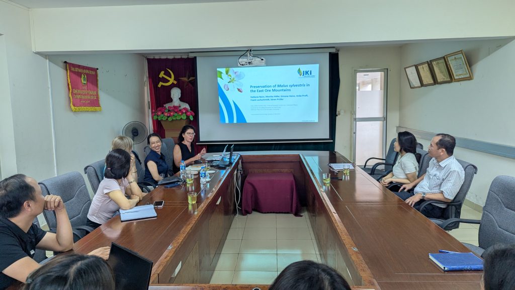 Trong khuôn khổ dự án hợp tác quốc tế về nghiên cứu và bảo tồn nguồn gen cây ăn quả thực hiện năm 2025 do TS. Trần Thị Thu Hoài làm chủ nhiệm, từ ngày 07/9-22/9/2025, đoàn chuyên gia Đức gồm Tiến sĩ Doris Monika Hofer và Tiến sĩ Stefanie Barbara Reim thuộc Viện Nghiên cứu Giống Cây ăn quả Dresden-Pillnitz (Julius Kühn-Institut, Đức) đã có chuyến công tác tại Việt Nam và làm việc tại Trung tâm Tài nguyên thực vật. Trong chuyến công tác tại Việt Nam, các chuyên gia Đức cùng cán bộ nghiên cứu của Trung tâm đã có chuyến công tác tại xã Trà Linh và xã Trà Tập, TP. Đà Nẵng để điều tra khảo sát thu thập táo Malus doumeri.