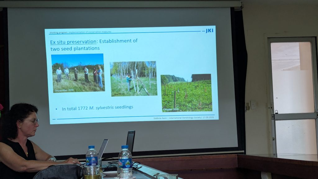 Tiếp theo, TS. Stefanie Barbara Reim, cũng từ Viện Nghiên cứu Giống Cây ăn quả Dresden-Pillnitz, trình bày chủ đề “Preservation of Malus sylvestris in East Ore Mountains” (Bảo tồn Táo dại Malus sylvestris ở phía Đông núi Ore). TS. Reim tập trung vào các nghiên cứu ứng dụng về bảo tồn loài táo dại tại khu vực Đông núi Ore (Đức), bao gồm quản lý sinh thái, thu thập và nhân giống và bảo tồn tại chỗ để bảo vệ đa dạng sinh học. Bà chia sẻ cách chuyển giao kiến thức cho cộng đồng địa phương, nhấn mạnh vai trò của luân canh, bảo vệ môi trường và chiến lược bền vững để hỗ trợ bảo tồn tại chỗ những cây thuần loài của loài này trước tác động của việc lai giữa các loài táo Malus với nhau.