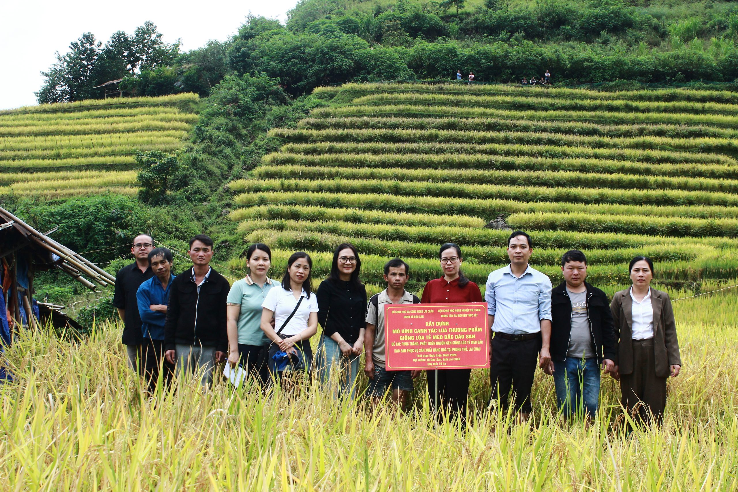 Sáng ngày 04/10/2025, Trung tâm Tài nguyên thực vật thuộc Viện Khoa học nông nghiệp Việt Nam phối hợp với Sở KH và CN tỉnh Lai Châu tổ chức Hội nghị đánh giá mô hình trình diễn canh tác lúa thương phẩm giống lúa Tẻ Mèo Bắc Dào San trong khuôn khổ nhiệm vụ: “Phục tráng, phát triển nguồn gen giống lúa Tẻ Mèo Bắc Dào San phục vụ sản xuất hàng hoá tại huyện Phong Thổ tỉnh Lai Châu” tại xã Dào San tỉnh Lai Châu. Tới dự Hội nghị về phía Trung tâm Tài nguyên thực vật có TS. Phạm Hùng Cương – Phó giám đốc Trung tâm; Đại diện Phòng KH và HTQT và Nhóm thực hiện nhiệm vụ. Về phía Sở KH và CN tỉnh Lai Châu có ông Phạm Quang Cường – Phó giám đốc Sở và đại diện Phòng Quản lý KH&CN. Về phía Sở Nông nghiệp và Môi trường có bà Long Thuý Vân – Phó Chi Cục trồng trọt và BVTV và đại điện Phòng Trồng trọt; Về phía địa phương có ông Trần Ngọc Khẩn, Phó Chủ tịch xã Dào San và đại điện Phòng Kinh tế, Phòng Văn hoá xã và các hộ dân tham gia trong mô hình, ngoài mô hình tại xã Dào San, tỉnh lai Châu.