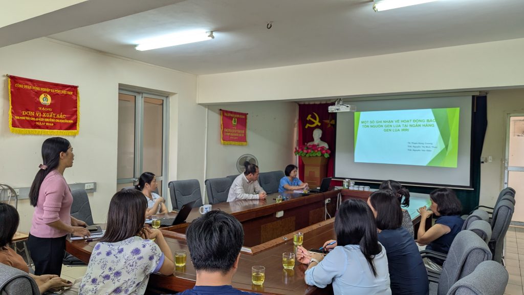 Buổi sinh hoạt có sự tham gia của đông đảo cán bộ, nghiên cứu viên Trung tâm cùng nhóm công tác vừa trở về từ Viện Nghiên cứu Lúa Quốc tế (IRRI). Báo cáo chuyên môn được trình bày bởi ThS. Nguyễn Thị Bích Thủy đại diện cho nhóm công tác, tập trung giới thiệu tổng quan về hoạt động của Ngân hàng gen lúa quốc tế và những kinh nghiệm có thể áp dụng tại Việt Nam.